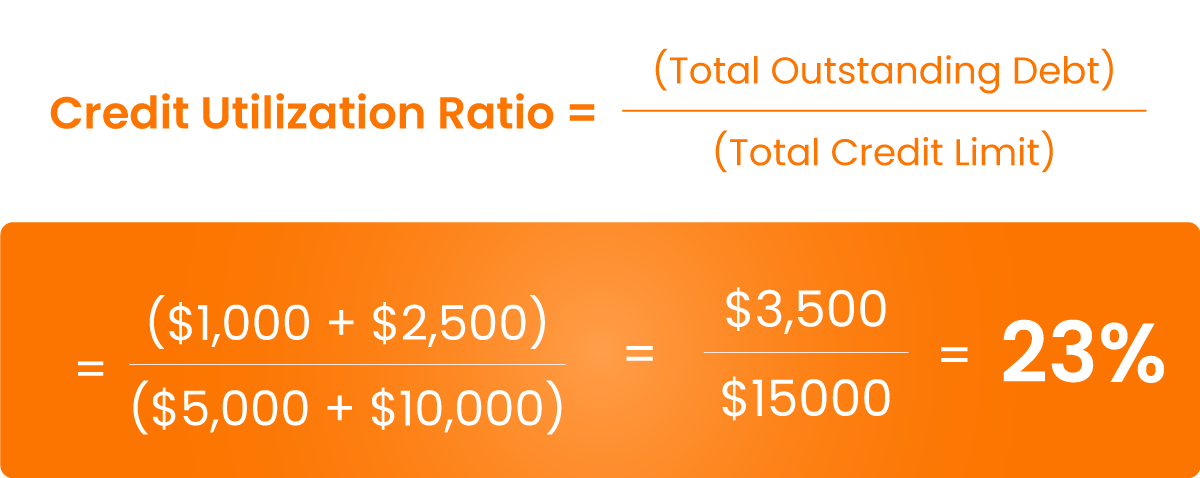 For example, if you have three credit cards with balances of £1,000, £2,500, and £4,000, and credit limits of £5,000, £10,000, and £8,000 respectively, your total balance is £7,500, and your total credit limit is £23,000. Your credit utilization ratio would be approximately 32.6%.